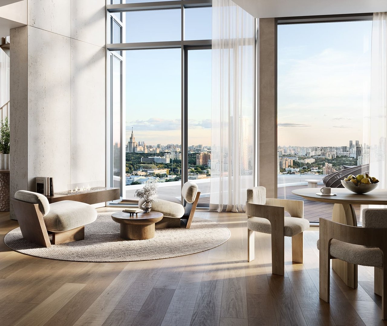 Из окон открываются одни из лучших видов на Москву: МГУ и Парк Победы, зелень Воробьёвых гор и изгибы Москвы-реки, а для любителей урбанистики — панорама Москва-Сити и знаменитые небоскрёбы запада столицы. Этот пейзаж становится частью повседневности, а свет и воздух на такой высоте создают ощущение свободы.