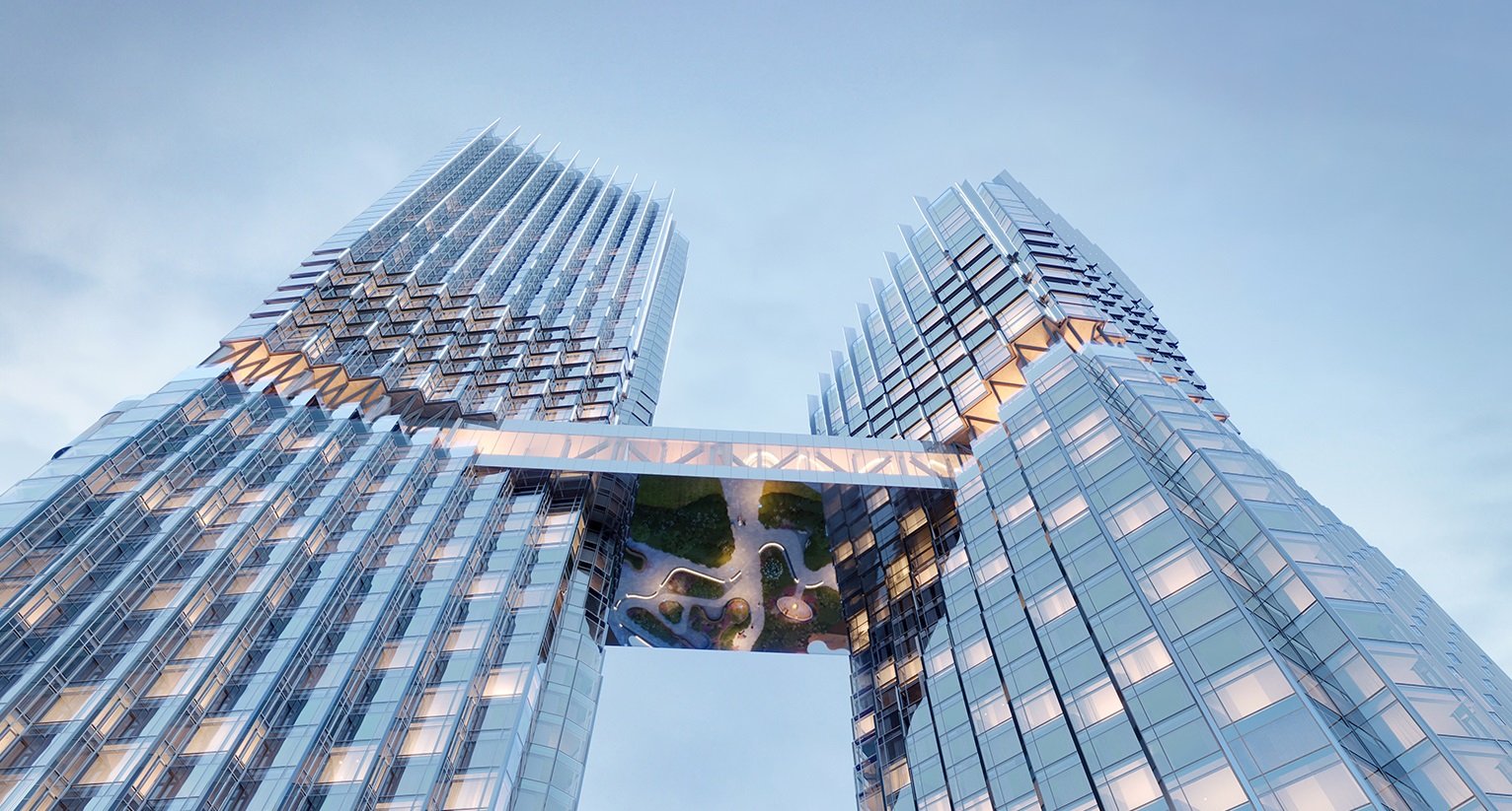 Проект KAMEN Architects с уникальным мостом между башнями на высоте 80 метров.
