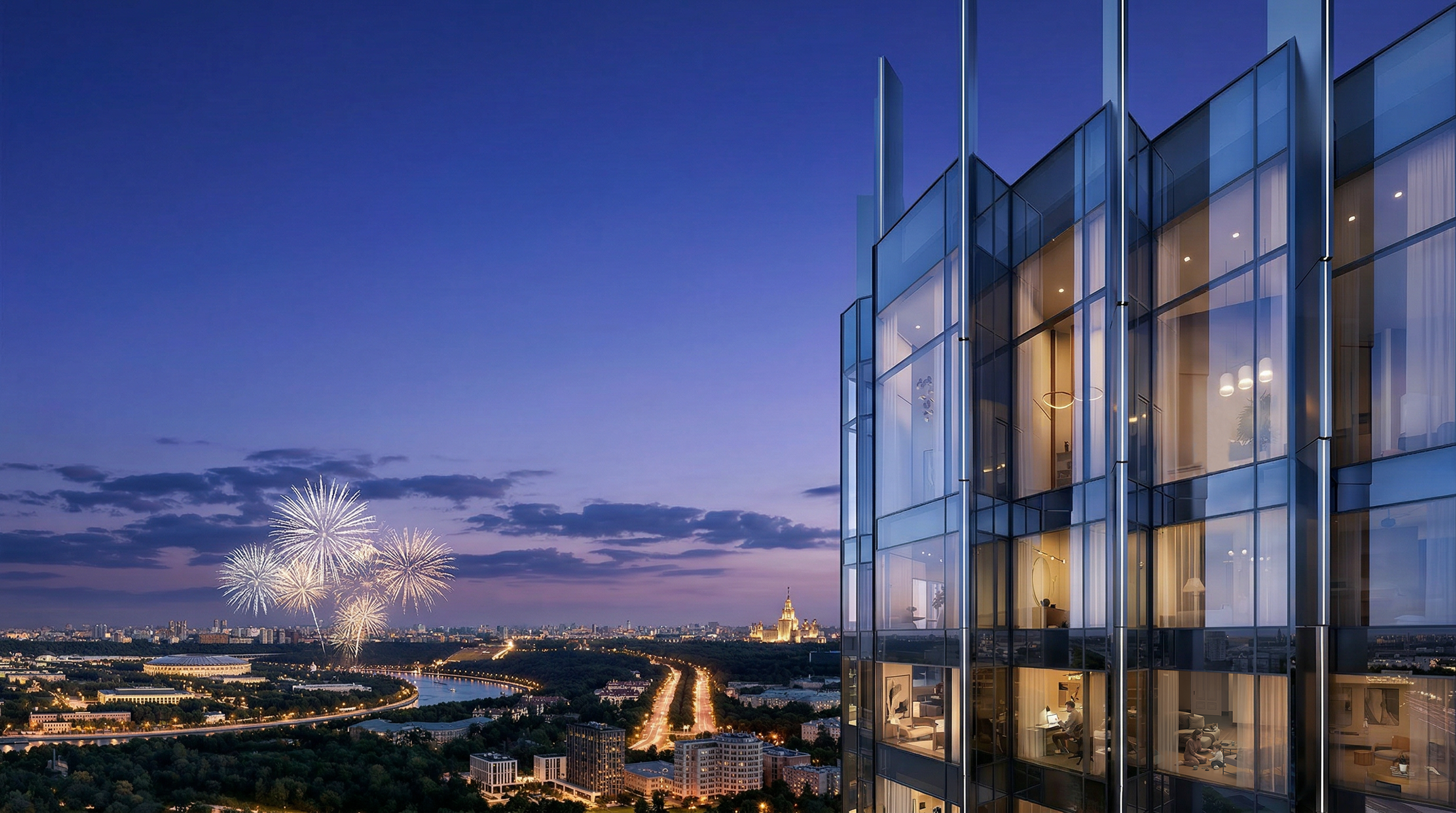 Захватывающие виды из панорамных окон на Москву-реку, Лужники, МГУ, Воробьевы горы,