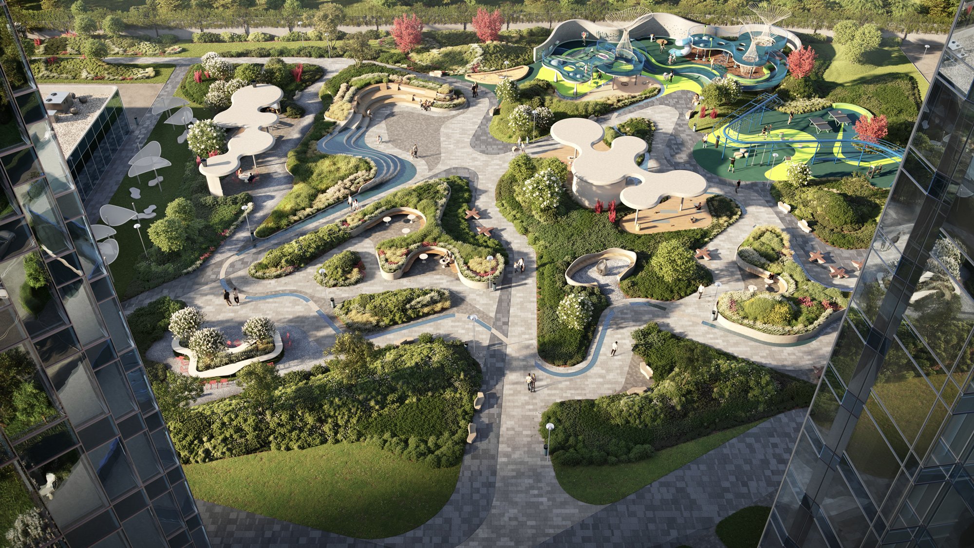 Зеленые оазисы соседствуют с футуристичными арт-объектами.